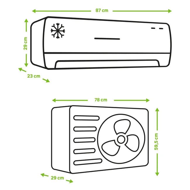 Medidas de la unidad interior: 87 x 29 x 23 cm. Medidas de la unidad exterior: 78 x 59 x 29 cm (ancho x alto x fondo). Entrega a pie de vehículo.