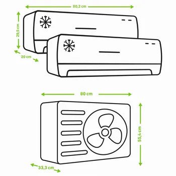 Medidas del split 1: 72,9 x 29,2 x 20 cm. Medidas del split 2: 80,2 x 29,5 x 20. Medidas de la unidad exterior: 80 x 55,4 x 33,3 cm (ancho x alto x fondo).